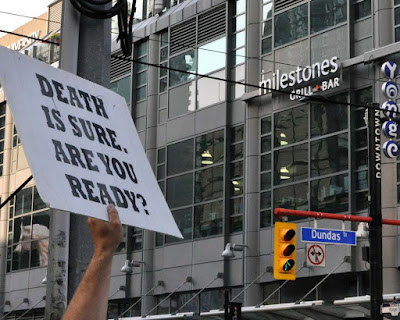 The crowded #Toronto sidewalk serves as background for many a sign - this one says "Death is sure. Are you ready?" For long trips make sure you have your new PRESTO GO Transit card!