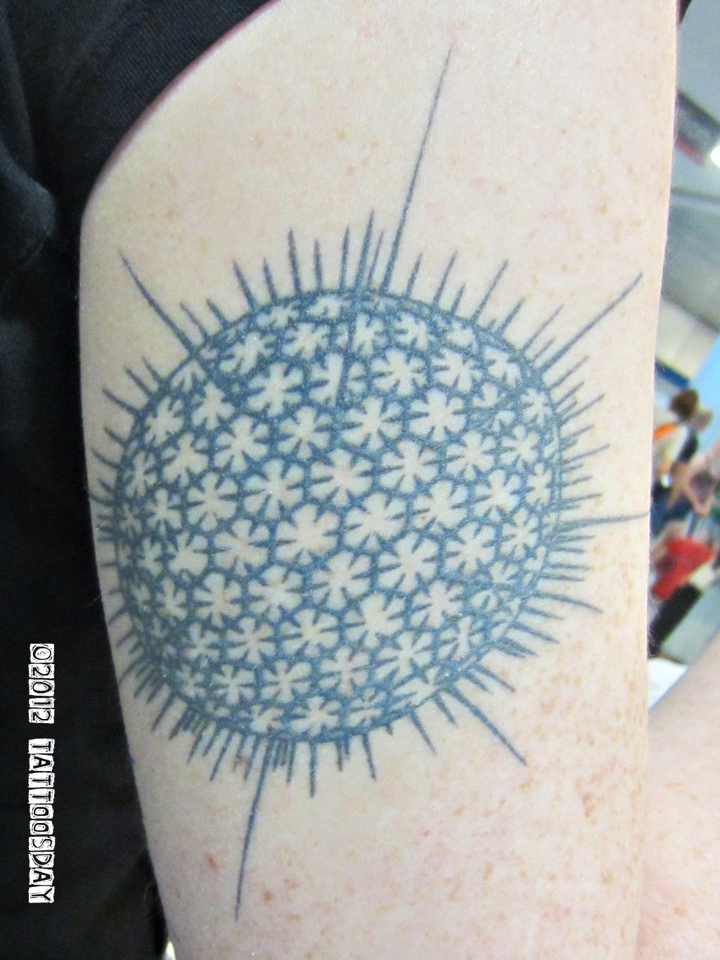 Lucy explained that this is based on an illustration by German biologist/naturalist Ernst Haeckel and depicts a creature known as a radiolarian, an amoeboid protozoa. This is something you would see on the great science tattoo site, Carl Zimmer's Science Tattoo Emporium